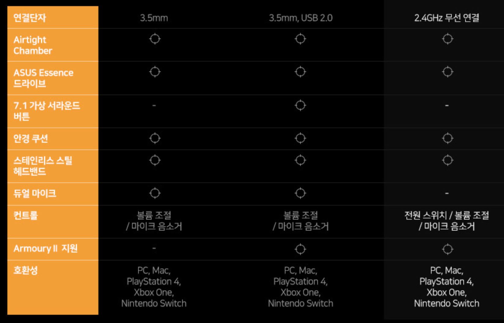 헤드셋은 먼저 스테인리스 스틸로 제작된 헤어밴드, 장시간 착용해도 편안한 헤드쿠션, 사용자에 맞게 조절가능한 이어컵, ASUS 하이브리드 이어패드, 손끝에 닿는 3가지 컨트롤러, 높은 음질의 분리형 마이크, 그리고 무선연결 USB커넥터로 구성되어 있습니다.